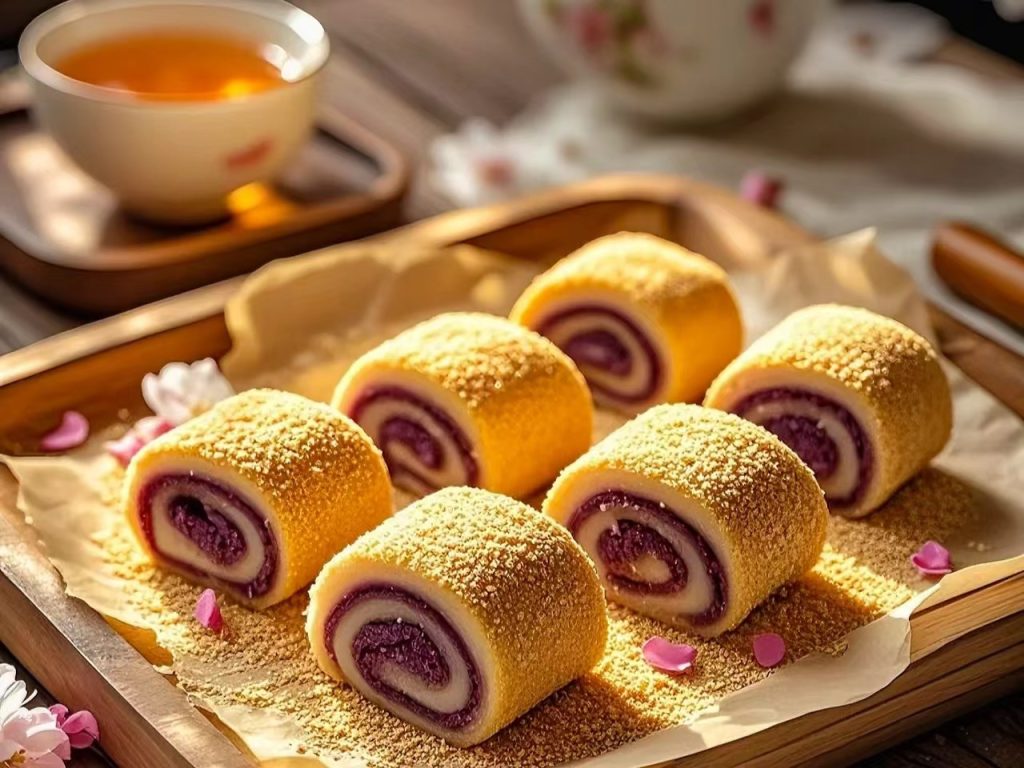 Lvdagun: Sweet glutinous rice rolls with bean paste, coated in soybean flour.