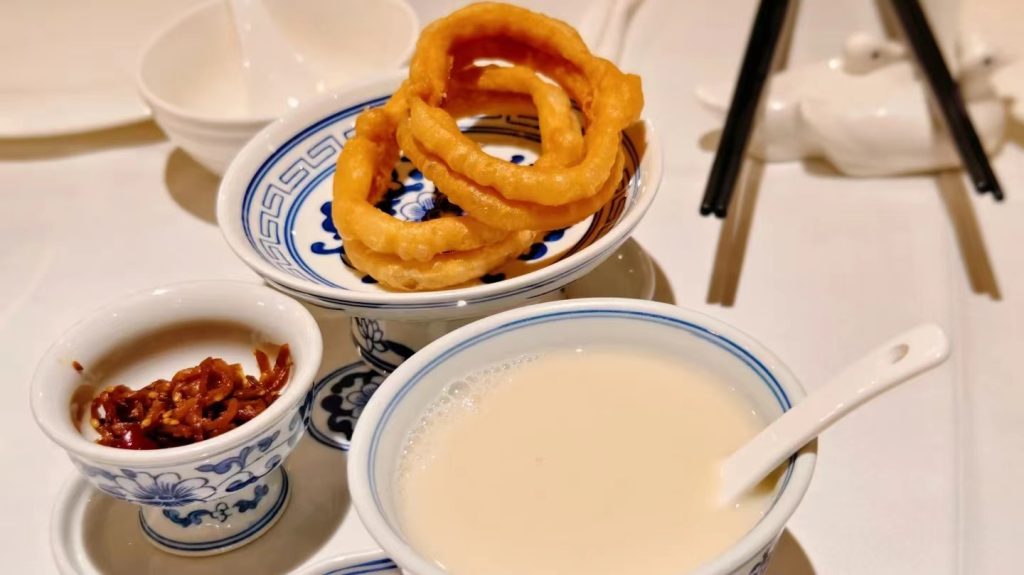 Douzhi & Jiaoquan: Fermented mung bean drink with fried dough rings, culturally unique breakfast.