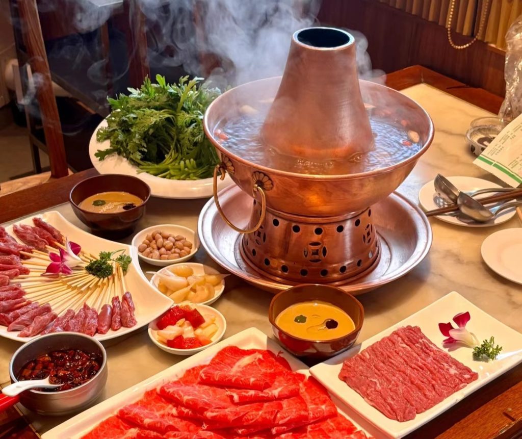 Copper Pot Hotpot: Thinly sliced lamb cooked over charcoal, dipped in sesame sauce.